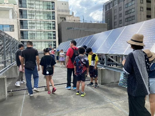 子ども40人、保護者36人が参加。環境プラザの施設見学と屋上の太陽光パネルを見学しました。