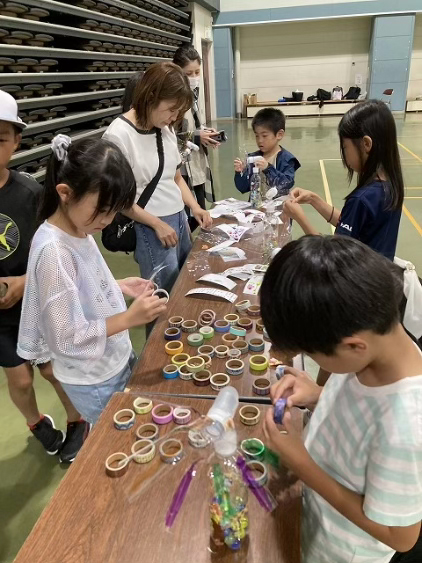 学生ボランティアのサポートのもと、全員が時間内に完成!団扇で風を送ると羽根が回り、LEDランプが赤く光る仕組みに子どもたちは大喜び。 保護者からも「工作で羽を工夫し、風で電気がついたことを喜んでいる姿を見られて良かった」「工作は自分なりに工夫できる時間があり、装飾もとても楽しんでいた」との声が寄せられました。